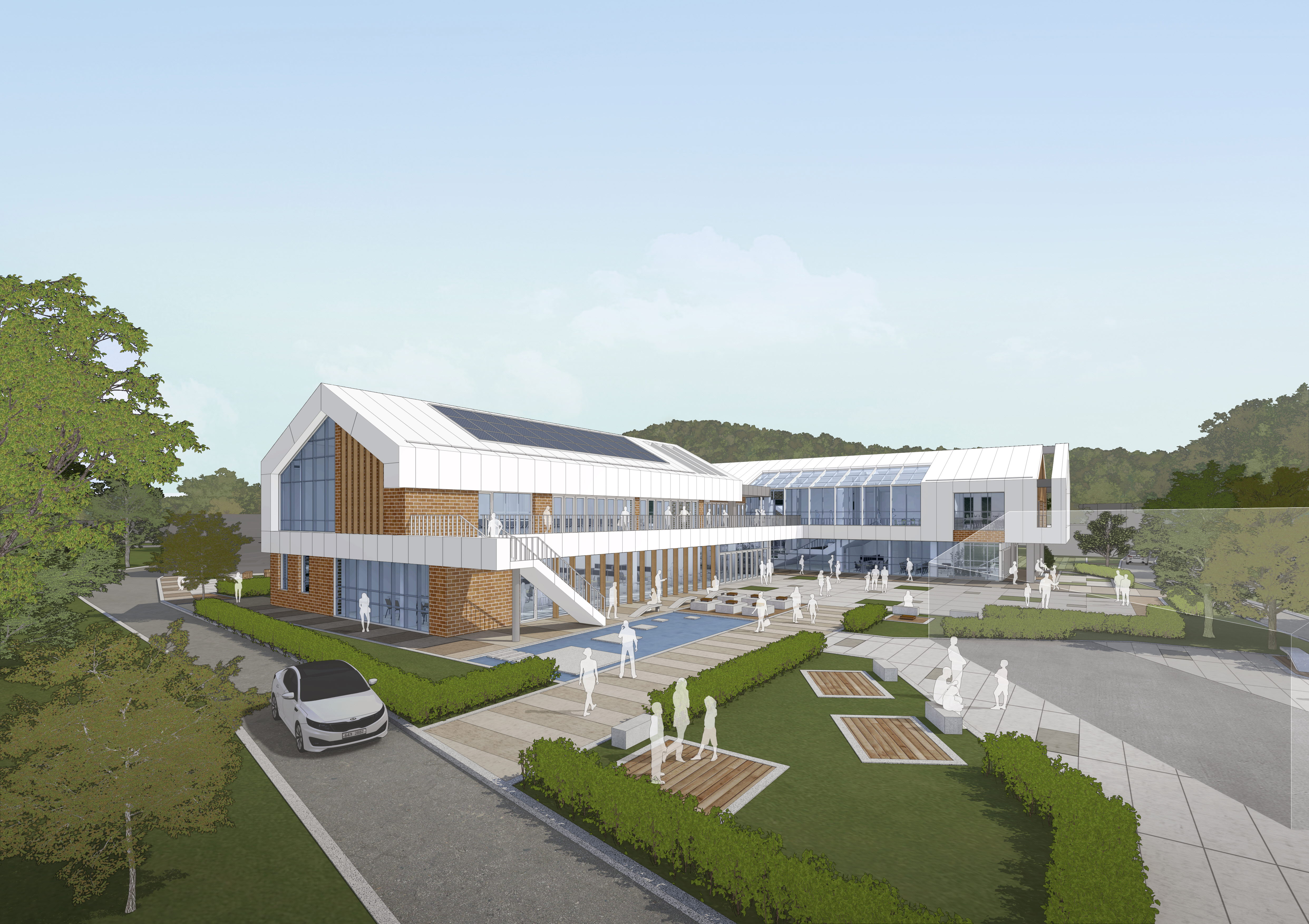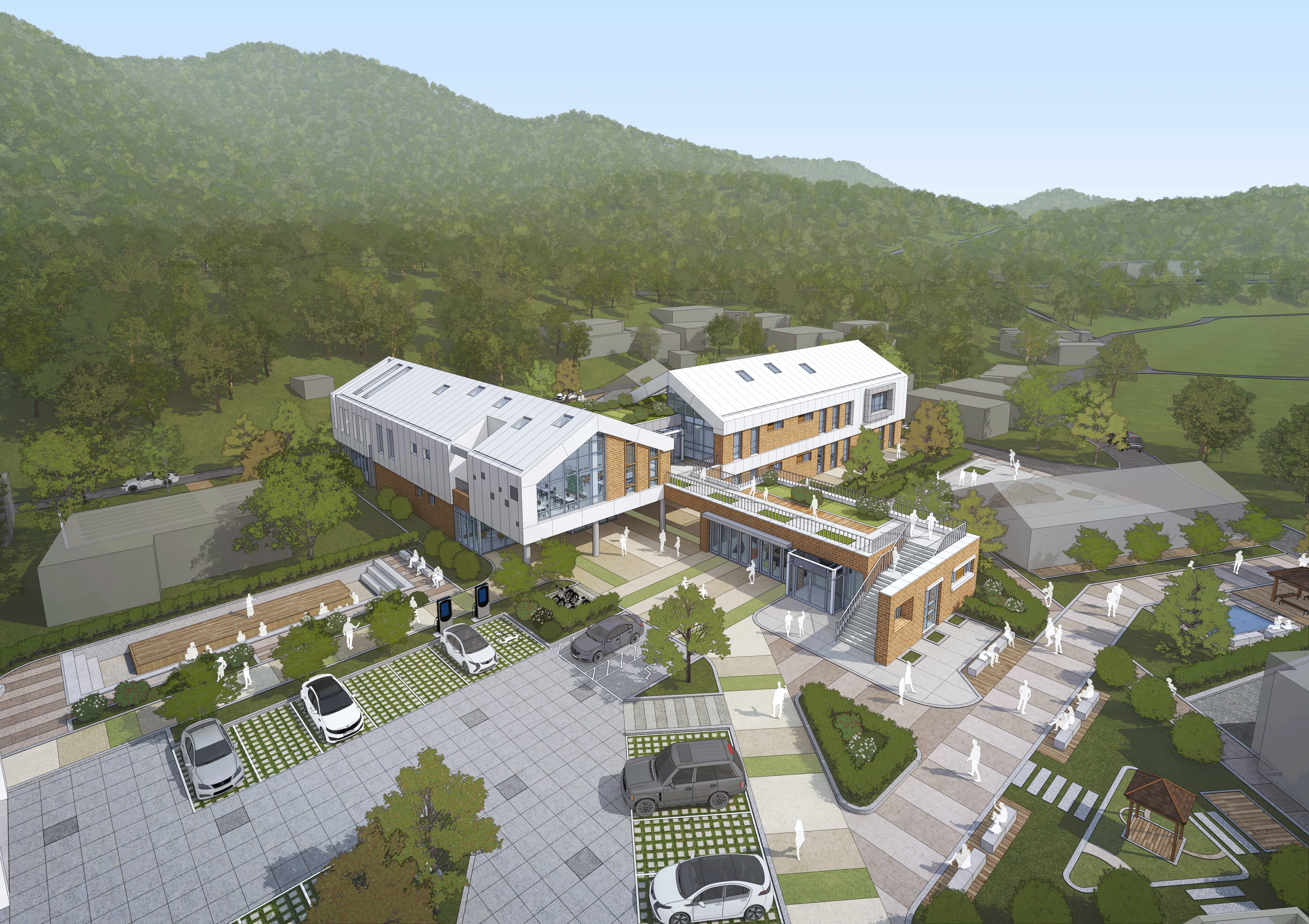 하나의 중심에서 사방으로 뻗어나가는 건물의 형태는 마치 계곡면의 길과 들판, 그리고 주민의 일상을 닮았다. 바람개비처럼 열린 배치는 마을의 방향을 모아내며 길의 중심에서는 어르신들과 아이들, 방문객과 직원들의 만남과 소통의 모습을 볼 수 있다. 나눔과 돌봄, 행정과 배움, 휴식과 교류의 교차를 통해 한층 더 풍요로워진 계곡면의 모습을 만들어내는 기초생활거점시설 계곡+를 제안한다.